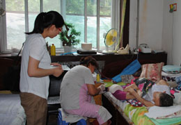 当协会一行来到春辉养老院后,我们正好看到春辉养老院张俊荣院长在闷热的桑拿天气下,汗流浃背的正在为82岁的陈景芳老人仔细的清理她脚上的伤口, 张俊荣院长笑着对我们说“张会长对不起了我先给老人处理下请20分钟假”.
